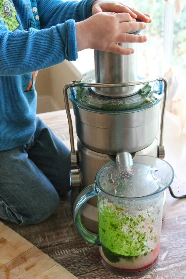 I think it's time to cleanse. Wylie and I worked on a magic potion together today and we think it's just what's needed to make us well. We named it Christmas Juice after it's pretty holiday ingredients. It's made with cranberries, astringent and excellent for cleansing the kidneys and liver, sweet ripe pears rich in fiber and Vitamin C, Antioxidant powerhouse kale and tummy-soothing ginger. The juice was delicious, our little Typhoid Mary drank his entire 4oz serving in a matter of seconds. He even tried a few raw cranberries on their own (so tart!) and liked them. Here's to our health!