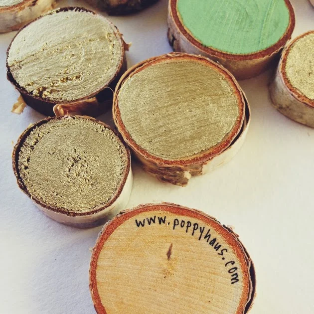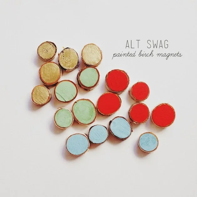 /I will be headed on the first plane out of Oakland tomorrow morning to join in on the festivities at Alt Summit in Salt Lake City. This will be my second time at the conference, and I get to go with Blurb, so I'm feeling pretty calm considering I don't know anyone really all that well. I found the right dress to wear to the "Green" party, I've got my outfits packed, my seminars picked out (this will be the year of video!) and I finally seem to have kicked my wicked stomach bug. After I hit the publish button on my last post, I stood up, got super sick, and went to bed for 20 hours. I didn't know if I'd be able to get this one last thing done, but sitting and painting is actually really relaxing. Along with my business cards, I will also be handing out these little painted birch magnets as little takeaway to remember my blog by. I wanted to do something that would relate to my new book, which features projects that re-imagine simple materials into something useful and pretty. To make your own follow the tutorial below. See you at Alt? Come say hi! My name is Heather, and I look like the silly girl up top without the paper crown and glasses.