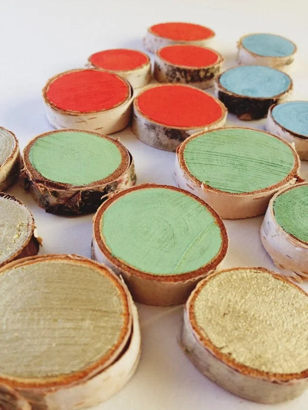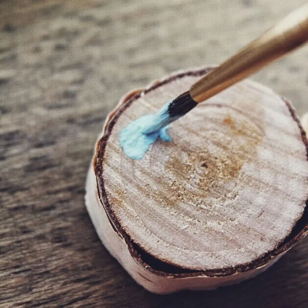 Step 2: carefully apply paint to the more attractive side of a birch piece. Start by making a ring around the outside, then filling in.