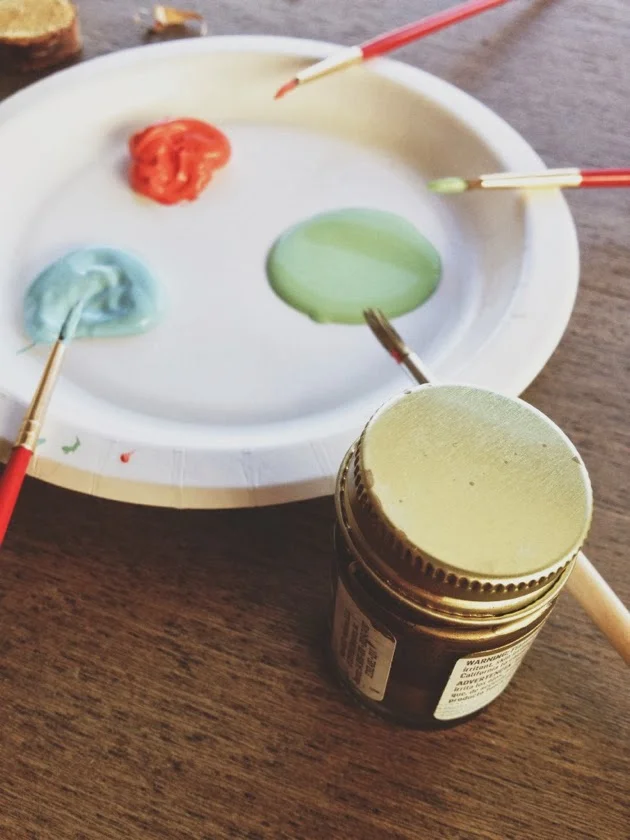 Materials: Pre-cut birch pieces (Michaels, size Medium), 1/2" round magnets, acrylic paint, gold leaf paint, fine tip paint brushes, hot glue.